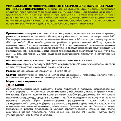 Грунт-эмаль СПЕЦНАЗ 3 в 1 (преобразователь ржавчины/грунтовка/ декоративное покрытие) предназначен для защиты стальных и чугунных поверхностей, покрытых ржавчиной и остатками старого покрытия, плотно сцепленными с металлом: конструкций, в том числе крупногабаритных, со сложным профилем, очистка которых затруднена (решетки, ограды, гаражи), при ремонтной окраске деталей автомобиля (крылья, днища), и др.