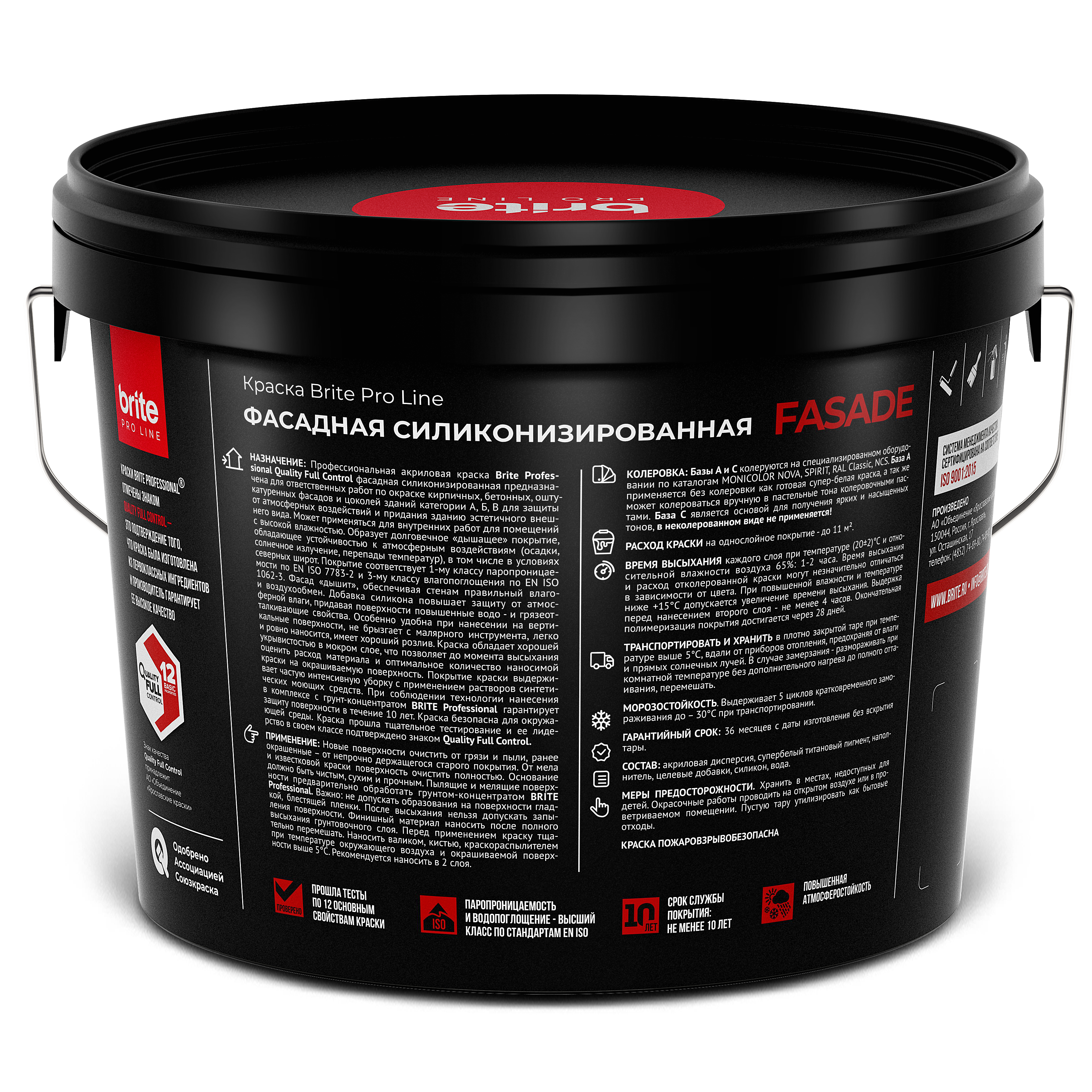 Профессиональная акриловая краска Brite Professional Quality Full Control фасадная матовая с добавлением силикона. Образует долговечное дышащее покрытие, устойчивое к атмосферным воздействиям и перепадам температур, в том числе в условиях северных широт. По результатам тестов демонстрирует повышенные водо- и грязеотталкивающие свойства, не растекается при нанесении на горизонтальные поверхности. Выдерживает частую интенсивную уборку с применением растворов синтетических моющих средств и гарантирует защиту поверхности в течение 10 лет. Безопасна для окружающей среды.