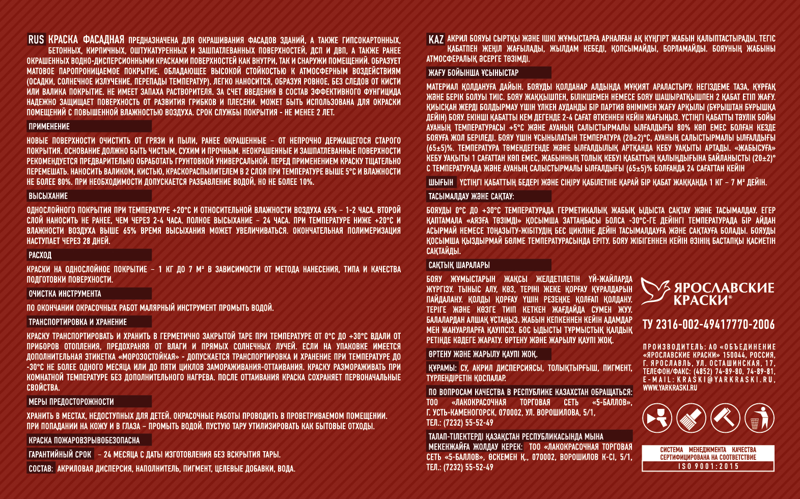 Транспортирование и хранение: Краску транспортировать и хранить в герметично закрытой таре при температуре от 0оС до +30оС вдали от приборов отопления предохраняя от влаги и прямых солнечных лучей. Если на упаковке имеется дополнительная этикетка «МОРОЗОСТОЙКАЯ» - допускается транспортировка и хранение при температуре до -30оС не более одного месяца или до пяти циклов замораживания-оттаивания. Краску размораживать при комнатной температуре без дополнительного нагрева. После оттаивания краска сохраняет первоначальные свойства.