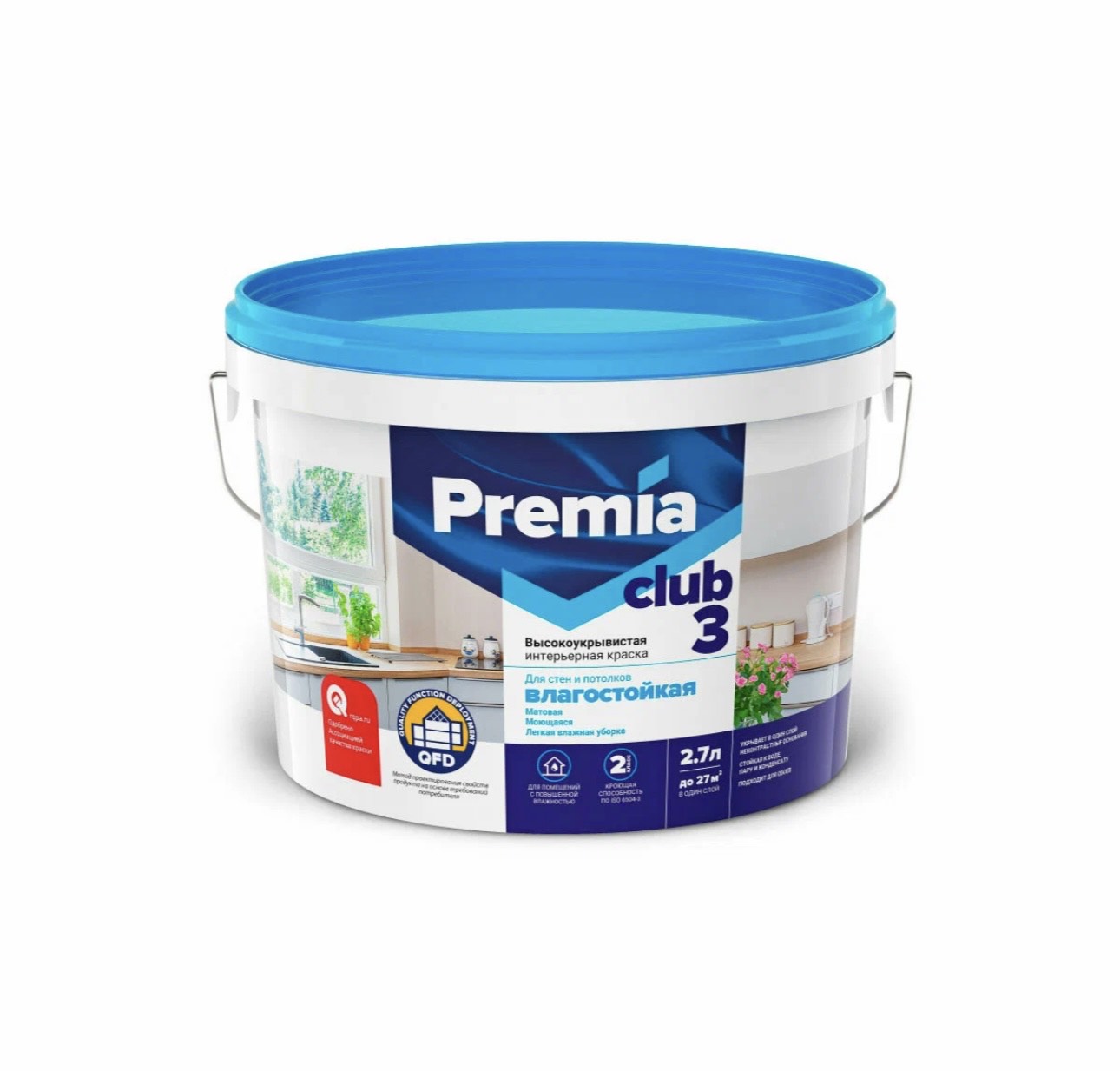 Влагостойкая акриловая краска для стен и потолков PREMIA CLUB 3 - лучший выбор для тех, кто любит удобство и комфорт. Она легко наносится, образуя матовое покрытие, стойкое к воде, пару и конденсату, поэтому может использоваться как в сухих помещениях, так и в помещениях с повышенной влажностью (кухни, ванные комнаты, и.т.д).
