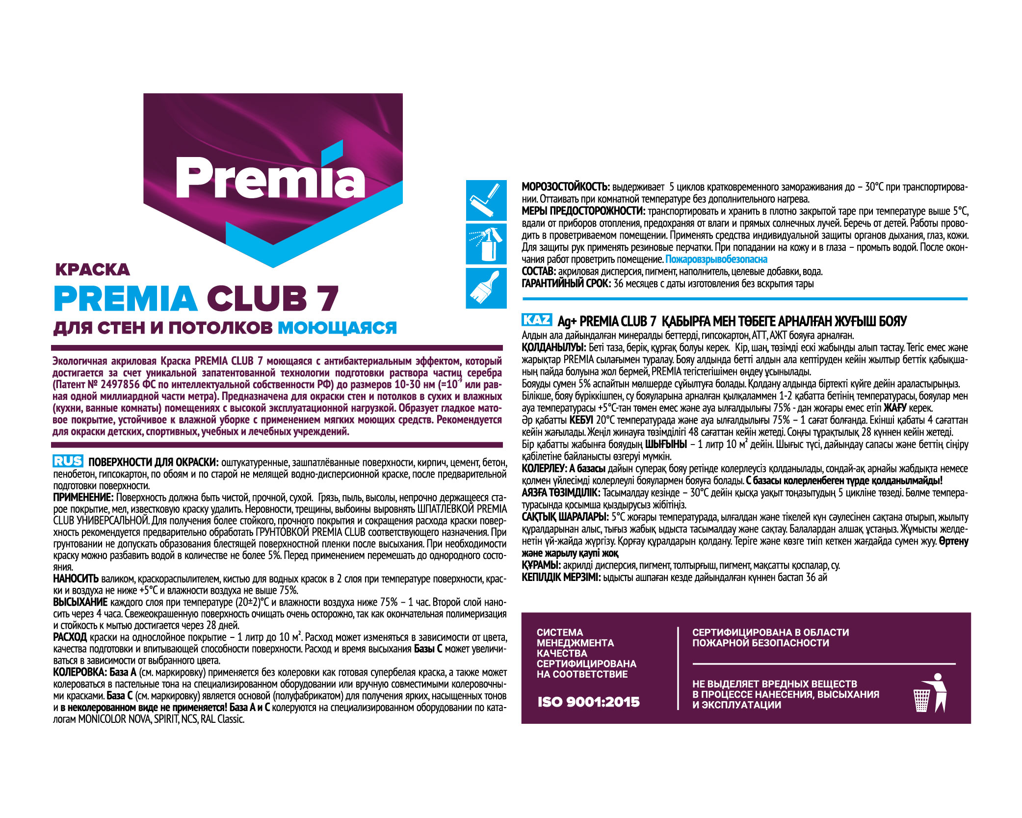 Моющаяся краска PREMIA CLUB 7 с антибактериальным эффектом идеально подойдет для создания дизайна и уюта помещений с высокой эксплуатационной нагрузкой. После высыхания образует гладкое матовое покрытие, которое скроет мелкие дефекты, надёжно защитит поверхность от влаги и плесени и придаст помещению современный эстетичный вид.